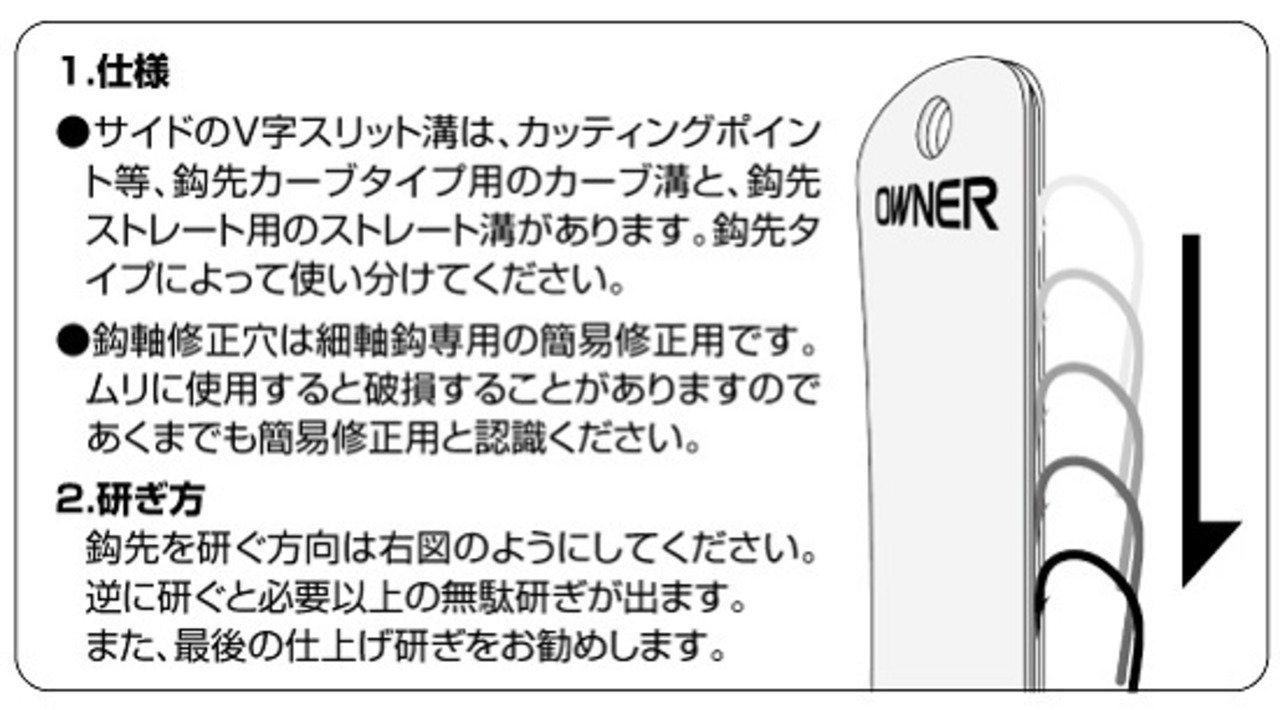 鈎を研ぐことは、鈎表面のコーティングを削りとるため、錆びに対する耐蝕性を著しく低下させることになります。シャープニング作業はあくまで現場での応急対応とお考えください。
