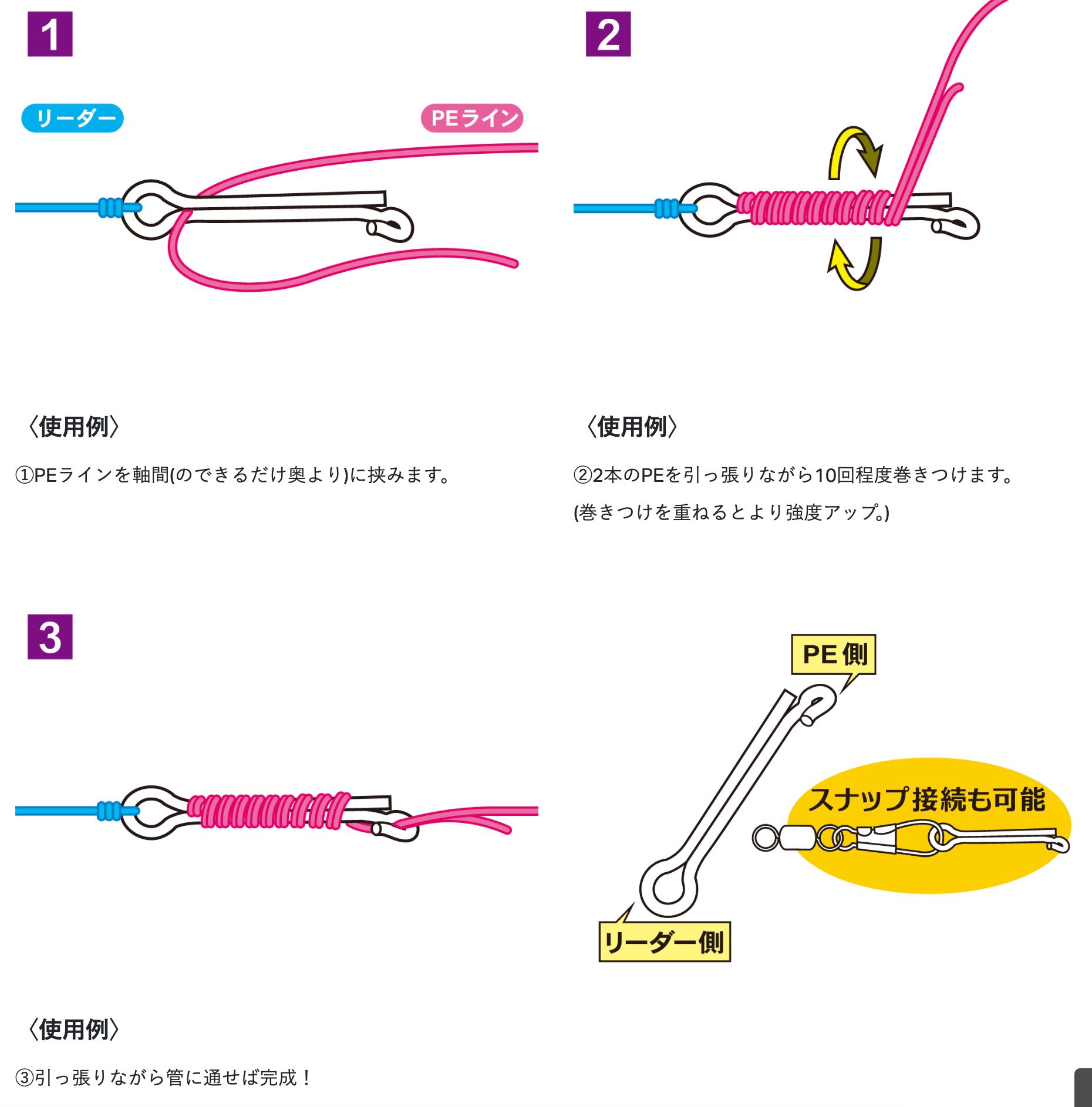 挟んで巻いて通すだけ!PEラインとリーダーを素早く簡単に接続できる超便利アイテム!複雑なノットに匹敵する結束強度最大90%以上を実現!!